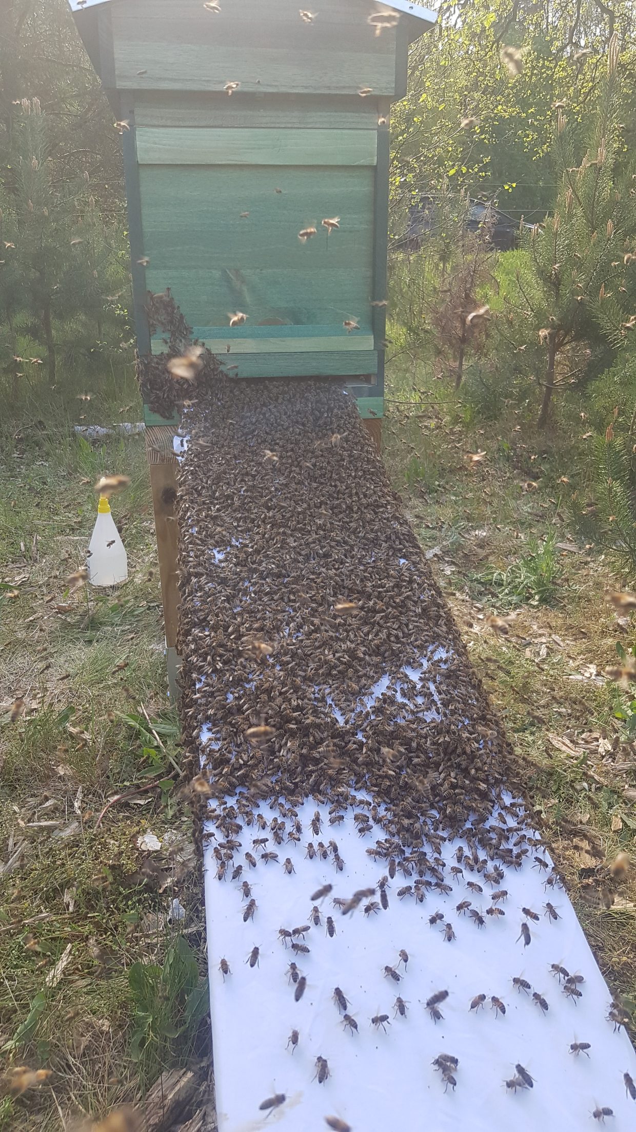 Zu fortgeschrittener Stunde, als die Sonne bereits hinter dem Waldrand verschwunden ist und nur noch vereinzelt durch das Blätterdach blinzelt, wird es dann spannend. Eine weiß betuchte Rampe wird mit sanftem Anstieg zum dunklen Eingang der Beute vorbereitet. Das Bienenvolk, wenn auch schon merklich unruhig dennnoch als Traube in der Schwarmkiste harrend, wird vorsichtig auf die Rampe entlassen. Die Bienenmasse ergießt sich wie zähe Flüssigkeit und breitet sich rasch aus. Tausende kleiner, beflügelter Leiber entdecken die dunkle, heimatverheißende Öffnung und wie ein Strom fließen sie empor und verschwinden freudig summend in ihr neues Zuhause.